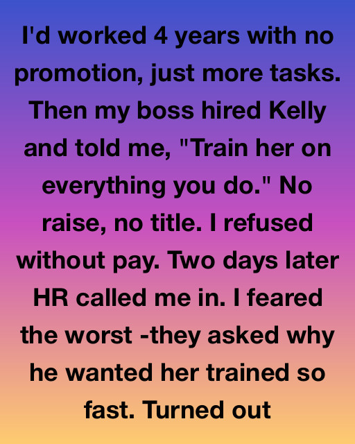 I’d worked 4 years with no promotion, just more tasks. Then my boss hired Kelly and told me, “Train her on everything you do.” No raise, no title. I refused without pay. Two days later, HR called me in. I feared the worst -they asked why he wanted her trained so fast. Turned out my boss, Mr. Sterling, was secretly under review for incompetence, and Kelly was the crucial piece of evidence in his ongoing corporate audit.