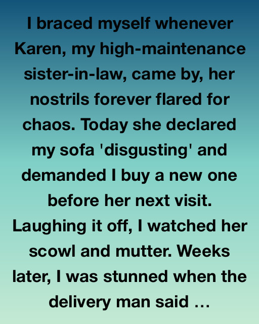 I braced myself whenever Karen, my high-maintenance sister-in-law, came by, her nostrils forever flared for chaos. Today she declared my sofa ‘disgusting’ and demanded I buy a new one before her next visit. Laughing it off, I watched her scowl and mutter. Weeks later, I was stunned when the delivery man said he had a new sofa for me, sent by someone named Karen.
