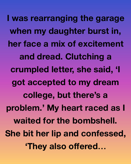I was rearranging the garage when my daughter burst in, her face a mix of excitement and dread. Clutching a crumpled letter, she said, “I got accepted to my dream college, but thereโ€™s a problem.” My heart raced as I waited for the bombshell. She bit her lip and confessed, “They also offered a scholarship, but it only covers half of the fees. I’m not sure what to do.”