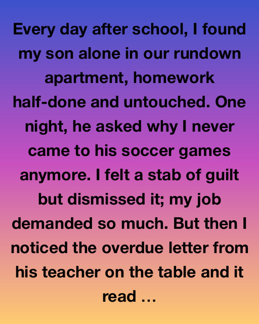 Every day after school, I found my son alone in our rundown apartment, homework half-done and untouched. One night, he asked why I never came to his soccer games anymore. I felt a stab of guilt but dismissed it; my job demanded so much. But then I noticed the overdue letter from his teacher on the table and it read how concerned she was about his sudden drop in grades.