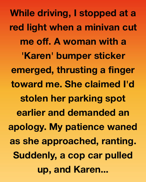 While driving, I stopped at a red light when a minivan cut me off. A woman with a ‘Karen’ bumper sticker emerged, thrusting a finger toward me. She claimed I’d stolen her parking spot earlier and demanded an apology. My patience waned as she approached, ranting. Suddenly, a cop car pulled up, and Karen’s tirade came to an abrupt halt.