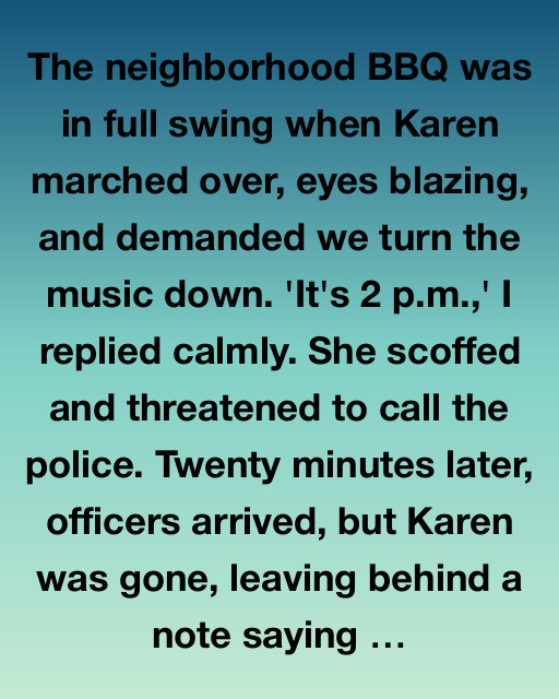 Reading the note, we suddenly felt a wave of empathy, realizing there was more to Karen’s irritation than a mere aversion to midday music. The officers looked at us with a mixture of bewilderment and sympathy, as if to say they had seen it all before but were still surprised by how life unfolds.
