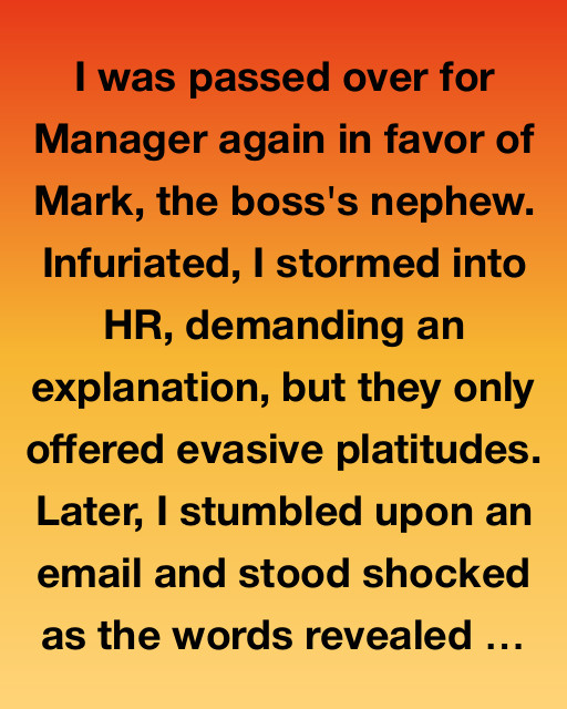 I was passed over for Manager again in favor of Mark, the boss’s nephew. Infuriated, I stormed into HR, demanding an explanation, but they only offered evasive platitudes. Later, I stumbled upon an email and stood shocked as the words revealed a decision made weeks ago without even considering my qualifications.