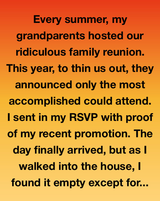 Every summer, my grandparents hosted our ridiculous family reunion. This year, to thin us out, they announced only the most accomplished could attend. I sent in my RSVP with proof of my recent promotion. The day finally arrived, but as I walked into the house, I found it empty except for a small card on the table waiting for me.