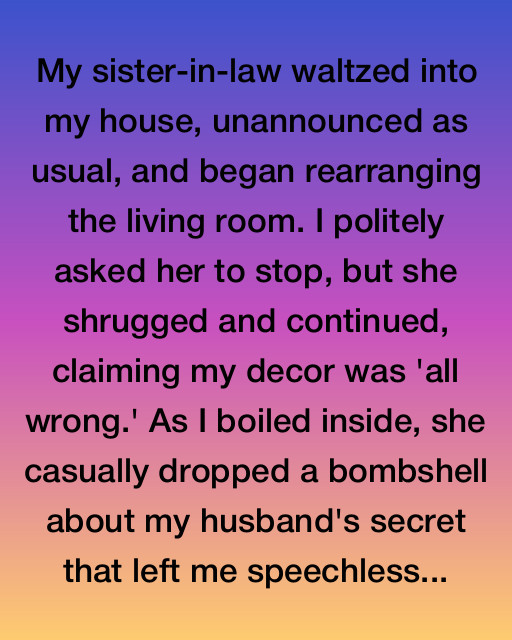 My sister-in-law waltzed into my house, unannounced as usual, and began rearranging the living room. I politely asked her to stop, but she shrugged and continued, claiming my decor was ‘all wrong.’ As I boiled inside, she casually dropped a bombshell about my husband’s secret that left me speechless.