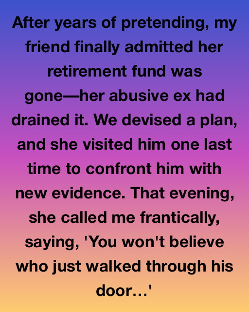 After years of pretending, my friend finally admitted her retirement fund was goneโher abusive ex had drained it. We devised a plan, and she visited him one last time to confront him with new evidence. That evening, she called me frantically, saying, ‘You won’t believe who just walked through his doorโฆ’