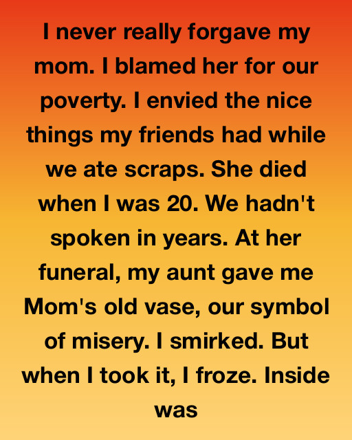 I never really forgave my mom. I blamed her for our poverty. I envied the nice things my friends had while we ate scraps. She died when I was 20. We hadn’t spoken in years. At her funeral, my aunt gave me Mom’s old vase, our symbol of misery. I smirked. But when I took it, I froze. Inside was a folded envelope, wedged deep near the bottom, almost like it had been hidden intentionally.