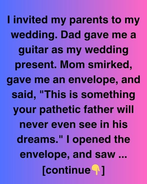 I invited my parents to my wedding. Dad gave me a guitar as my wedding present. Mom smirked, gave me an envelope, and said, “This is something your pathetic father will never even see in his dreams.” I opened the envelope and saw a check for $50,000.