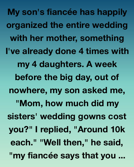 My son’s fiancée has happily organized the entire wedding with her mother, something I’ve already done 4 times with my 4 daughters. A week before the big day, out of nowhere, my son asked me, ‘Mom, how much did my sisters’ wedding gowns cost you?’ I replied, ‘Around 10k each.’ ‘Well then,’ he said, ‘my fiancée says that you should contribute the same amount toward her gown too.’