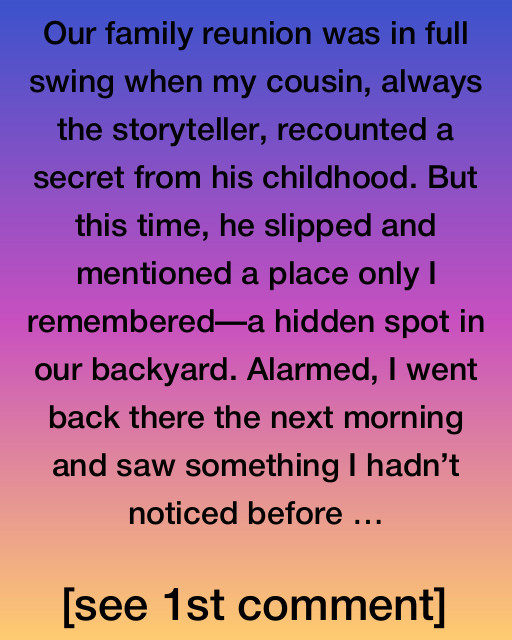 Our family reunion was in full swing when my cousin, always the storyteller, recounted a secret from his childhood. But this time, he slipped and mentioned a place only I remembered—a hidden spot in our backyard. Alarmed, I went back there the next morning and saw something I hadn’t noticed before. Under an old oak tree, there was a small patch of land where the grass grew in a curious circle, untouched by time.