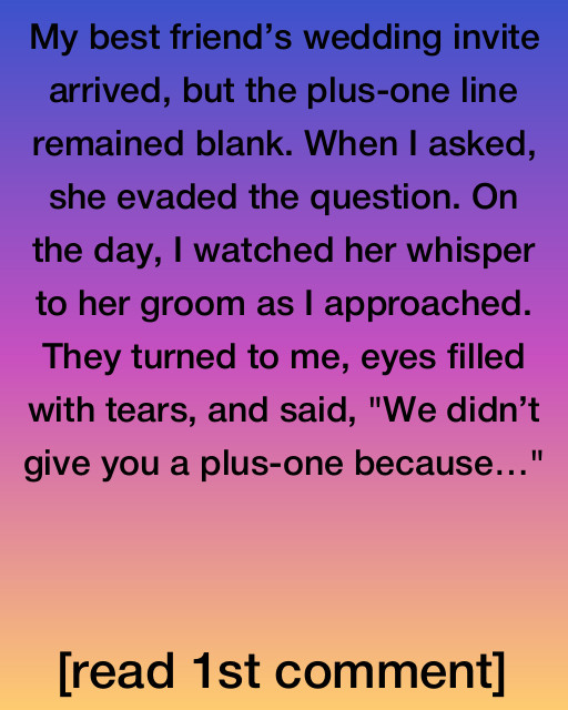My best friendโ€™s wedding invite arrived, but the plus-one line remained blank. When I asked, she evaded the question. On the day, I watched her whisper to her groom as I approached. They turned to me, eyes filled with tears, and said, โ€œWe didnโ€™t give you a plus-one becauseโ€ฆโ€