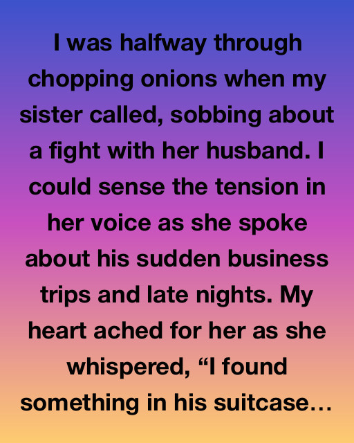 I was halfway through chopping onions when my sister called, sobbing about a fight with her husband. I could sense the tension in her voice as she spoke about his sudden business trips and late nights. My heart ached for her as she whispered, โI found something in his suitcaseโฆโ