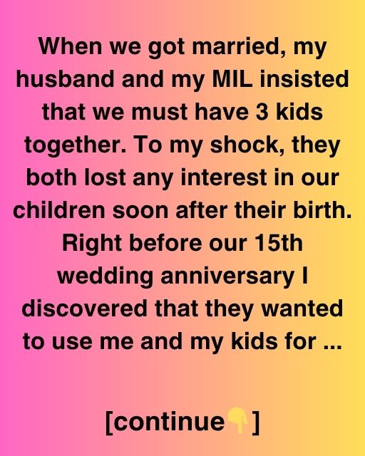 When we got married, my husband and my MIL insisted that we must have 3 kids together. To my shock, they both lost any interest in our children soon after their birth. Right before our 15th wedding anniversary I discovered that they wanted to use me and my kids for nothing more than an image โ€” a picture-perfect family for the outside world, to climb social ladders and impress the right people.