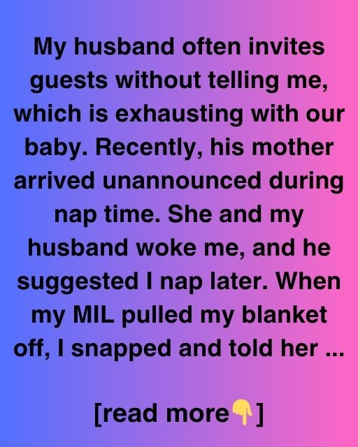 My husband often invites guests without telling me, which is exhausting with our baby. Recently, his mother arrived unannounced during nap time. She and my husband woke me, and he suggested I nap later. When my MIL pulled my blanket off, I snapped and told her, “Put that back. I’m not a hostess right now, I’m a mother who finally got her baby to sleep and is trying to rest.”