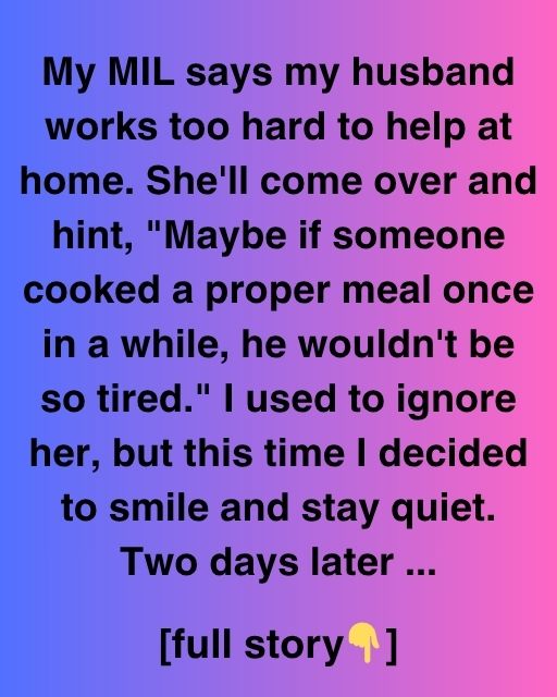 My MIL says my husband works too hard to help at home. She’ll come over and hint, ‘Maybe if someone cooked a proper meal once in a while, he wouldn’t be so tired.’ I used to ignore her, but this time I decided to smile and stay quiet. Two days later, I had a plan.